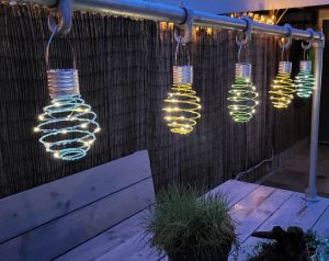 Solar buitenlamp Fiesta vrolijkt uw tuin, terras of balkon op met zijn fraaie kleuren en speelse vormgeving. Door de ophangbeugel kan de set van 9 hanglampen gemakkelijk en sfeervol in een boom, struik of aan een haak worden gehangen. Het zonnepaneel laadt de led buitenlamp op om vervolgens ‘s avonds warm wit sfeerlicht te geven aan de tuin. Erg energiezuinig dus. Kortom: bent u op zoek naar kleurrijke, energiezuinige en sfeervolle verlichting voor in de tuin? Dan is deze 3 kleuren set spiraalvormige hanglampen op zonne-energie voor u de juiste keuze!