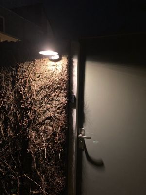 Op zich een prima product, maar op een zonnige novemberdag is de batterij om een uur of 6 ‘s avonds al leeg. Dan dus niet nuttig om de tuinpoort bij te lichten zoals op de foto. (Met extra 4,2V voeding werkt hij nu wel prima…)